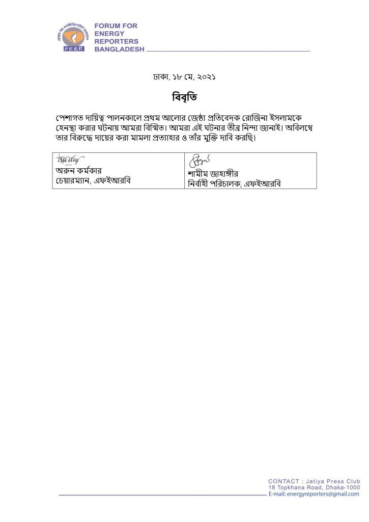 প্রথম আলোর জেষ্ঠ্য প্রতিবেদক রোজিনা ইসলামকে হেনস্থা করার ঘটনায় আমরা বিস্মিত। আমরা এই ঘটনার তীব্র নিন্দা জানাই।